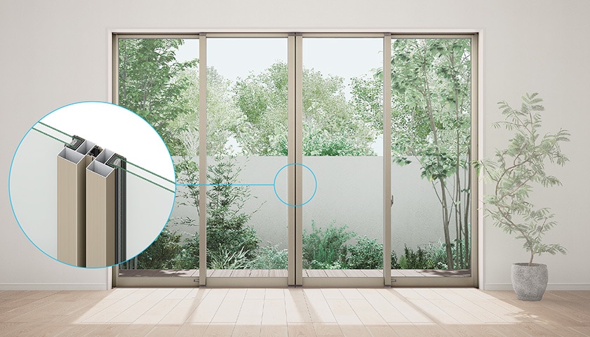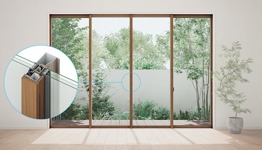 引違い窓4枚建では、TOSTEM独自の「スレンダーマリオン」構造を採用。