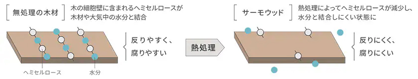 これは木材を高温の水蒸気で熱処理する技術で、木材の含水率を大幅に低下させます。