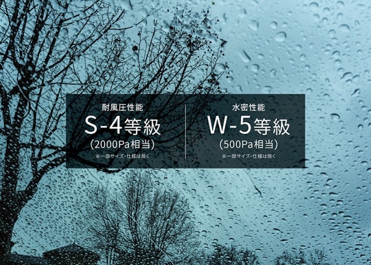 水密性もJIS規格最高グレードのW-5等級を達成。高層ビルや強風地域の建物でも採用されるレベルの水密性を確保しており、激しい雨でも室内への水の侵入を防ぎます。