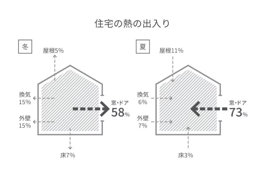 意外に思われるかもしれませんが、住まいの中で最も熱の出入りが多い場所は「窓」です。