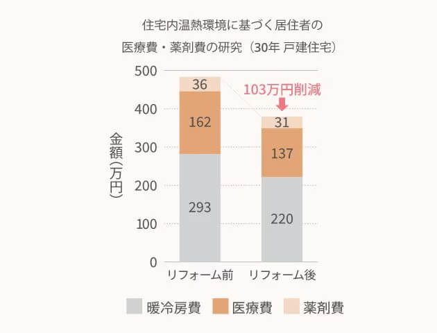 窓の断熱リフォームによって住まいが暖かくなると、暖冷房費だけでなく、医療費や薬剤費の削減にもつながるという研究結果も報告されています。
