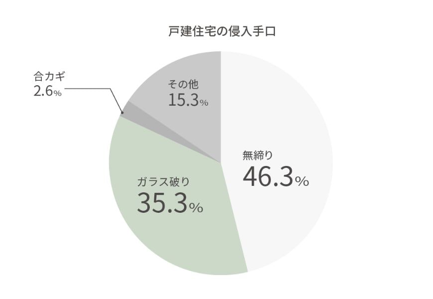 手口としては、「無締り(カギのかけ忘れ)」と「ガラス破り」の2つが大半を占めています。