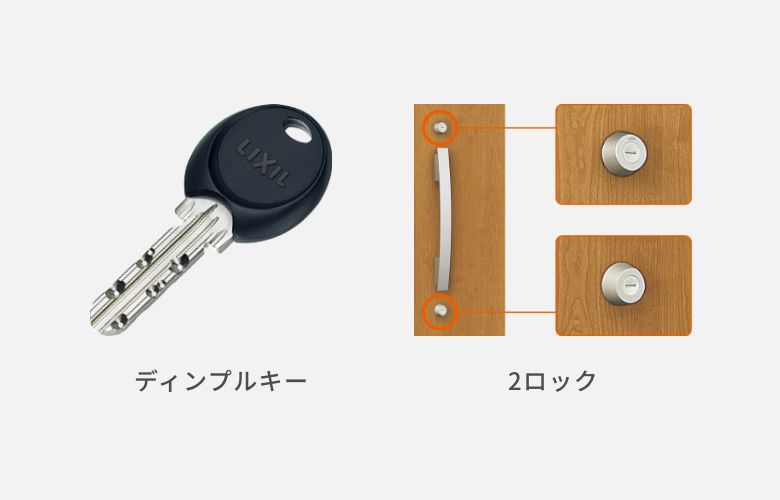 「ディンプルキー」「2ロック」など、ピッキング対策に有効なロックシステムを採用しています。