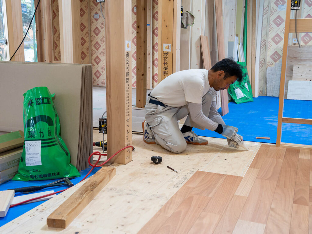 フローリングの施工は、大工さんが接着剤でしっかりと固定した上で釘打ちを行い、二重の施工を施しています。