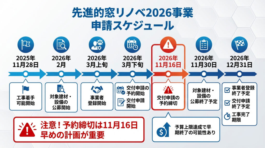 先進的窓リノベ2026事業の対象工事は、2025年11月28日以降に着手し、2026年12月31日までに完了するものです。