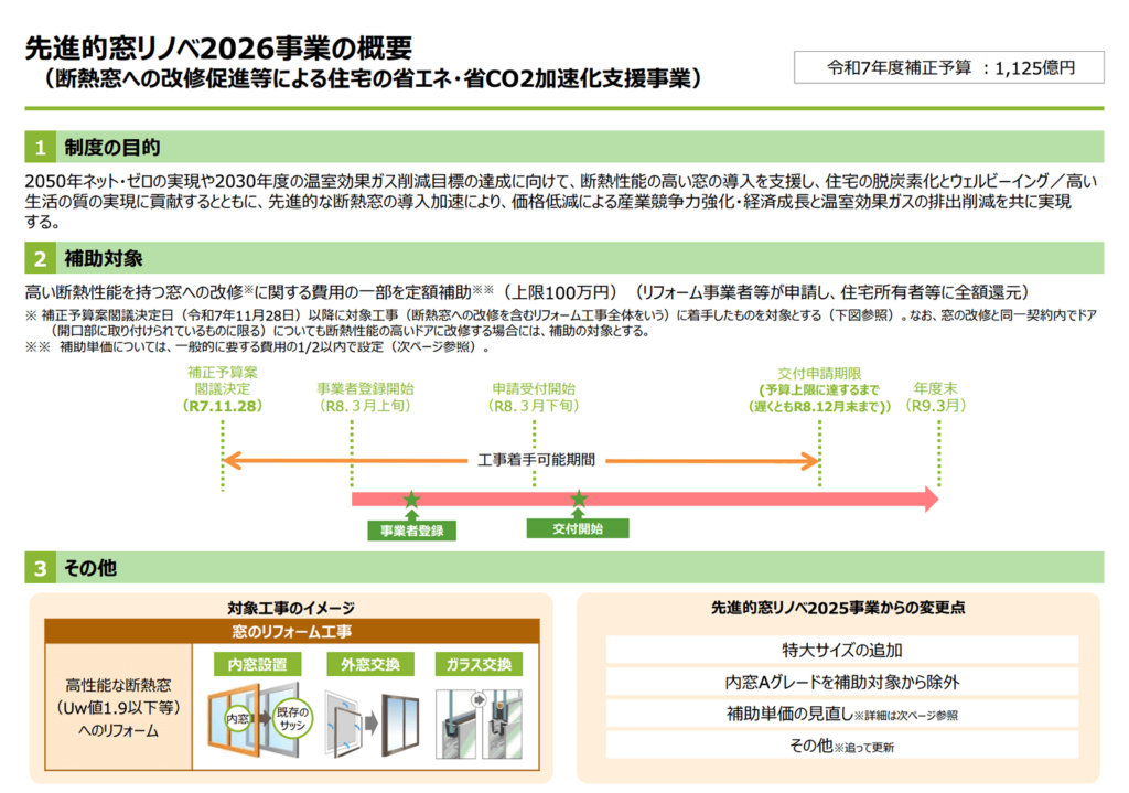 正式名称は「断熱窓への改修促進等による住宅の省エネ・省CO2加速化支援事業(先進的窓リノベ2026事業)」。